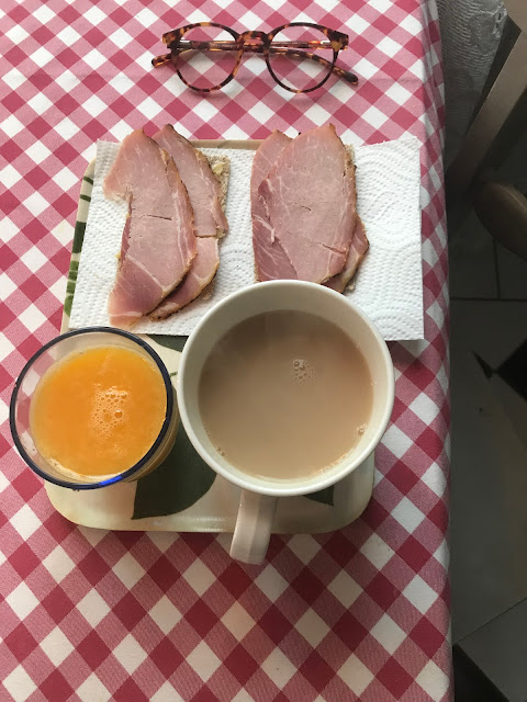 | Förhoppningsvis inte årets sista, men den senaste julhelgens sista skinkmacka till frukost. Vi skivade upp två hela skinkor, först vår riktiga egenkokade, som åts upp redan på annandag jul. Sedan har vi knaprat på en ersättningsprodukt, en färdigkokt, som smakmässigt var helt ok, men som vi fick skära bort fett och svål ifrån innan den kunde avnjutas. Vikten minskade med dessa åtgärder med ca 30 procent. |